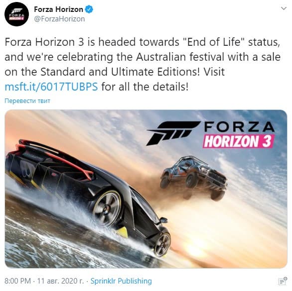 Студия Playground Games объявила в твиттере, что с 27 сентября 2020 года Forza Horizon 3 будет снята с продаж в Microsoft Store. То же самое случится и со всеми дополнениями к игре. Причина в достижении так называемого «конца жизненного цикла». Это довольно типичная ситуация, связанная, в том числе, с лицензированием автомобилей и музыки.