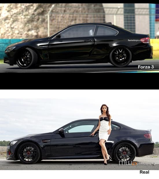 На сайте flameboys.co.cc проделали интересную работу, подобрав несколько фотографий реальных автомобилей с определенных ракурсов, которые соответствуют опубликованным скриншотам недавно анонсированного гоночного симулятора Forza Motorsport 3.