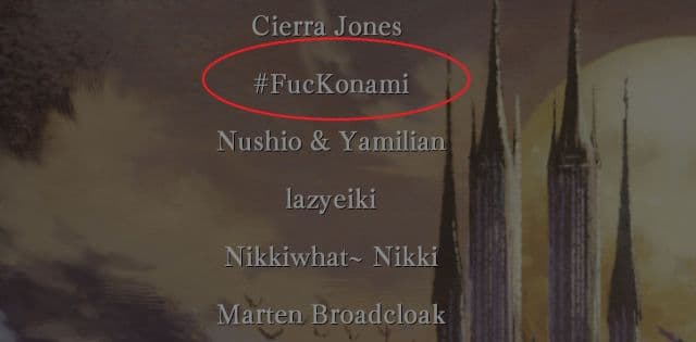 В частности, в титрах можно увидеть #FucKonami (ругательство в адрес Konami). Оно стало популярным в период, когда общественность узнала о конфликте между Konami и Хидео Кодзимой и отмене проекта Silent Hills от Kojima Productions. #FucKonami используют в случаях, когда говорят о неудачных решениях знаменитого в прошлом японского издательства.