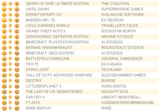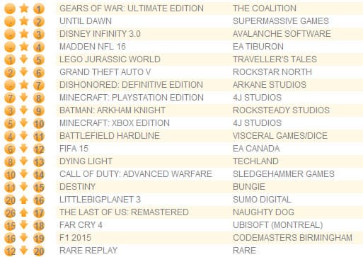 Переиздание Gears of War: Ultimate Edition взобралось на вершину британского чарта, который порадовал новыми лицами - пять игр в первое десятке вышли на прошлой неделе. Второе место досталось эксклюзивному для PS4 триллеру Until Dawn, третье место заняла игра Disney Infinity 3.0, а симулятор американского футбола Madden NFL 16 оказался на четвертой строчке.