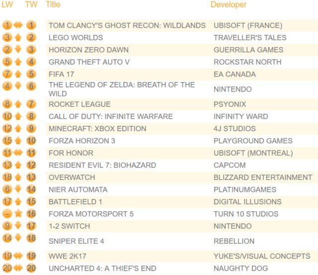 На первой строчке остался командный тактический боевик в открытом мире Ghost Recon: Wildlands. С третьего на второе место поднялся проект Lego Worlds (аналог Minecraft). Horizon: Zero Dawn опустился на третье место. The Legend of Zelda: Breath of the Wild обосновалась на шестой строчке.