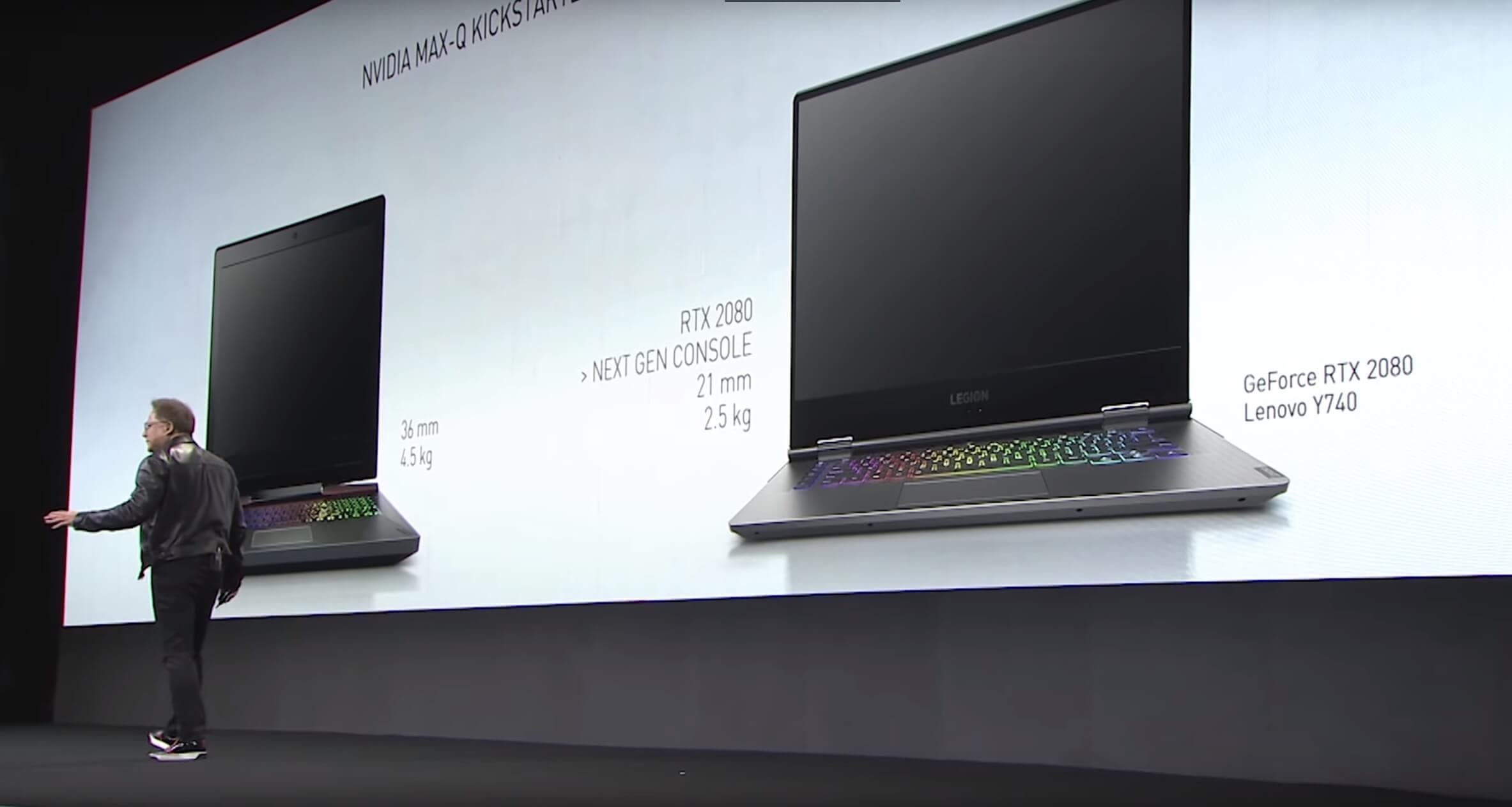 Дженсен Хуанг продемонстрировал представленный ниже слайд, на котором можно увидеть ноутбук с GeForce RTX 2080 и заметку о том, что видеокарта от Nvidia превосходит «консоль нового поколения».