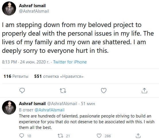 Исмаил ушёл с поста главы разработчиков Assassin's Creed Valhalla через несколько дней после того, как одна девушка рассказала о том, что Ашраф был в отношениях с ней, будучи женатым.