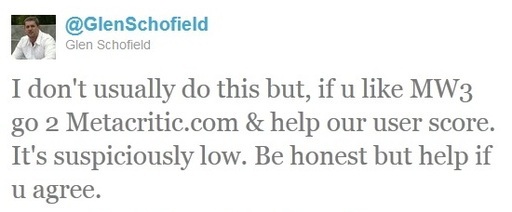 «Обычно я этого не делаю, но если вам нравится Modern Warfare 3, сходите на Metacritic и помогите поднять пользовательский рейтинг игры. Он подозрительно мал. Будьте честными, но помогите, если вы согласны».
