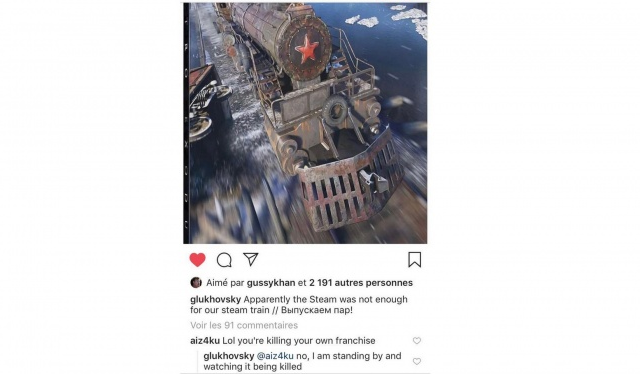 В Instagram Глуховского появилась картинка с поездом «Аврора» и подпись: «Кажется, нашему паровозу не хватило Steam [пара] // Выпускаем пар» (Steam - пар).