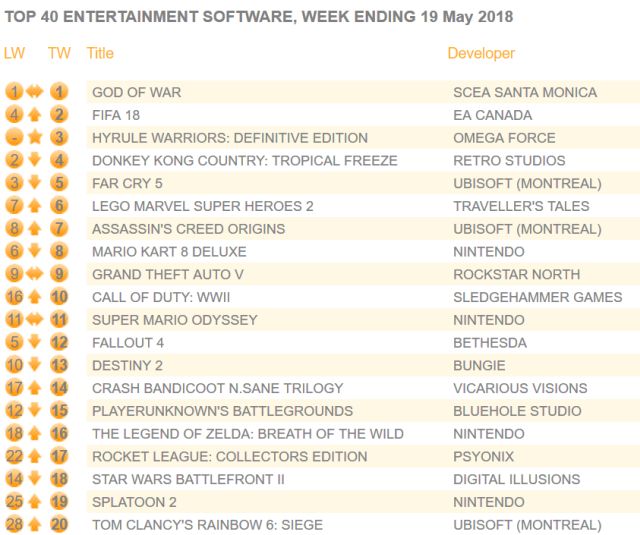 В сети появились данные о продажах физических версий игр на территории Британии за прошлую неделю. На первом месте остался проект God of War, продажи которого снизились на 35% по сравнению с предыдущей неделей. Игра уже пять недель подряд остаётся на первом месте чарта. The Last of Us 2013 года выпуска лидировала в Британии шесть недель подряд.