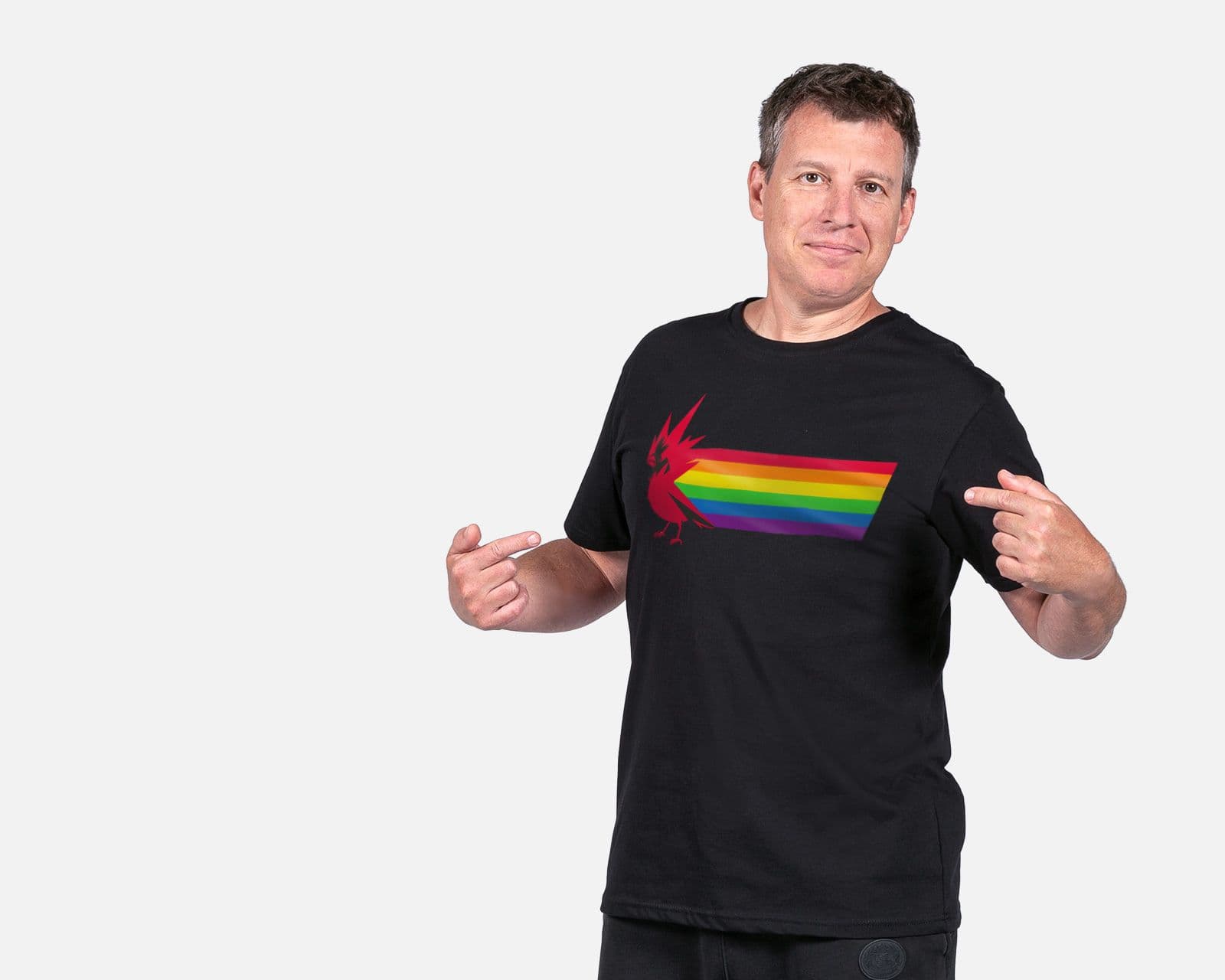 В официальном магазине компании CD Projekt Red появилась «радужная» футболка. На футболке изображён логотип компании и Радужный флаг – официальный символ сообщества ЛГБТК+. К вашим услугам разные размеры (от S до XXXL). Стоит такая футболка 15 евро.