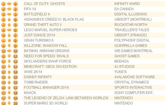 Тройка лидеров за прошедшую неделю не изменилась: Call of Duty: Ghosts, FIFA 14 и Battlefield 4 продолжают занимать свои места. Killzone: Shadow Fall с четвертой позиции переместился на девятую, уступив свое место Assassin’s Creed 4: Black Flag. GTA 5 поднялась на пару ступеней вверх, а вот Gran Turismo 6 смогла стартовать лишь с восьмой строчки чарта.