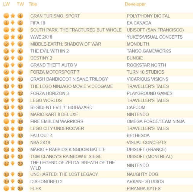 На третьем месте, пропустив вперёд FIFA 18, стартовала ролевая игра South Park: The Fractured But Whole, продажи которой за первую неделю сравнимы с показателями The Stick of Truth.