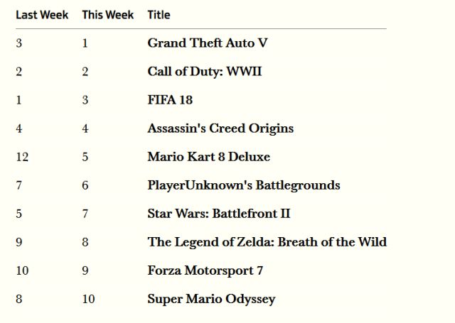 На втором месте остался шутер Call of Duty: WWII. Футбольный симулятор FIFA 18 опустился с первого на третье место. Mario Kart 8 Deluxe поднялся с 12-го на 5-е место, а продажи игры выросли на 26%.