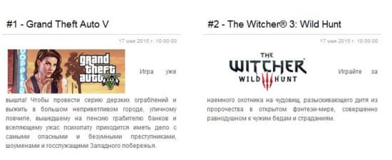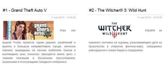 Первое место удерживает приключенческий боевик Grand Theft Auto V, предзаказы на The Witcher 3: Wild Hunt позволили игре еще до релиза подняться на вторую строчку. Комплект The Witcher 3: Wild Hunt с двумя анонсированными дополнениями занимает пятое место.