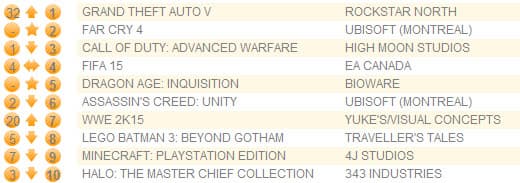 Far Cry 4 заняла второе место, продемонстрировав самые успешные продажи за первую неделю в истории серии, которой в этом году исполнилось 10 лет. Call of Duty: Advanced Warfare переместилась на третье место.