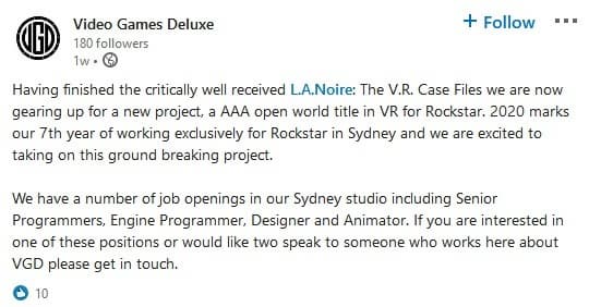 Сейчас Videogames Deluxe Sydney подтверждает, что готовится к новому проекту – портированию AAA-игры в открытом мире от Rockstar в VR. Разработчики не говорят идёт ли речь о новой игре или об уже существующей. Но, вероятно, речь о GTA V.