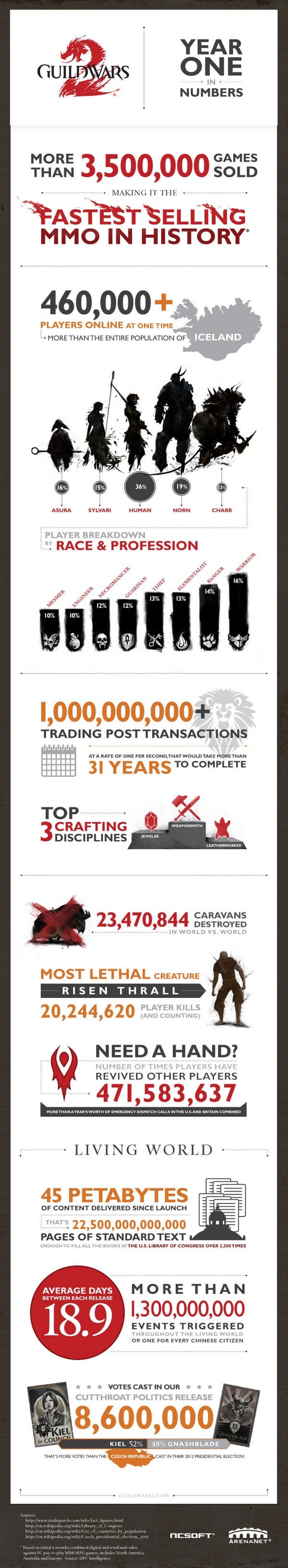 Многопользовательская онлайновая игра Guild Wars 2 празднует год со дня своего запуска, в связи с чем NCSoft и ArenaNet опубликовали статистику, которую мы и предлагаем вашему вниманию.