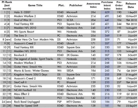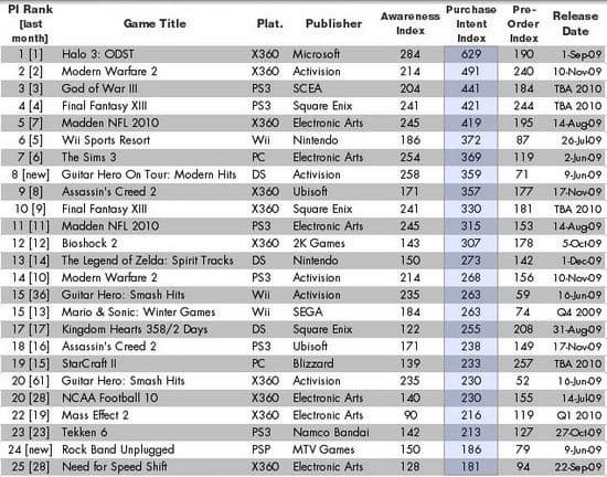 Согласно данным, опубликованным на сайте Gamasutra, игры Halo 3: ODST, Modern Warfare 2 и God of War 3 возглавляют список самых ожидаемых игр на территории США. В опросе, проведенном OTX/Gameplan, приняли участие более 1000 игроков самых разных жанровых предпочтений.