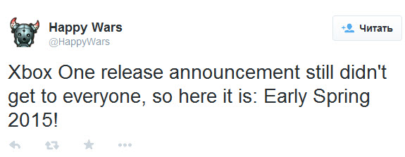 На официальной twitter-страничке игры Happy Wars, которая ранее вышла на РС и Xbox 360, была опубликована информация о том, что ее появление на Xbox One состоится в начале весны 2015.