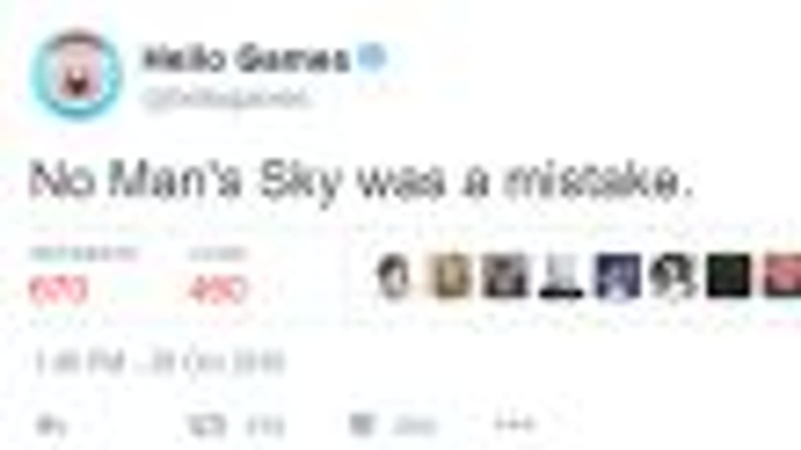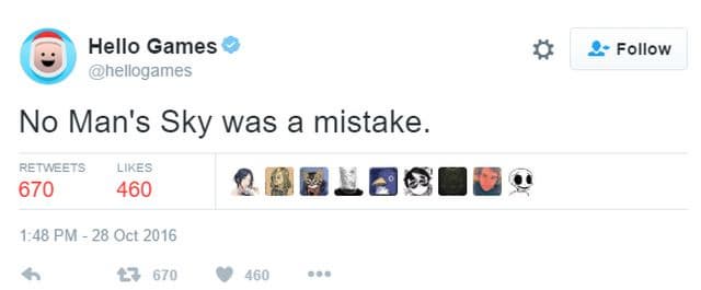 Сегодня в официальном твиттере компании Hello Games появилось не самое приятное сообщение следующего содержания: «No Man’s Sky была ошибкой». Вскоре это сообщение было удалено. Кроме того, пользователи больше не могли видеть сообщения в твиттере Hello Games. В сети появились слухи о том, что это сообщение опубликовал сам глава разработчиков No Man’s Sky и основатель Hello Games Шон Мюррей.