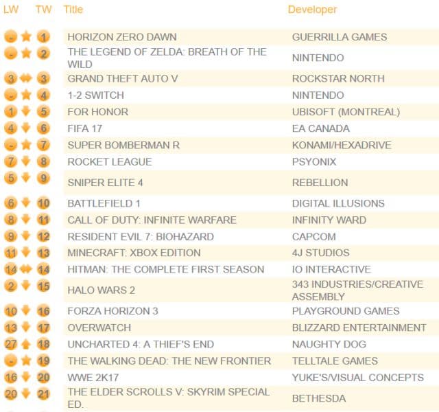 На четвертом месте списка самых продаваемых игр в Соединённом королевстве за прошлую неделю расположился сборник 1-2-Switch. Super Bomberman R для Switch дебютировал на седьмой строчке чарта. Лидер двух последних недель, боевик For Honor, опустился с первой на пятую строчку.