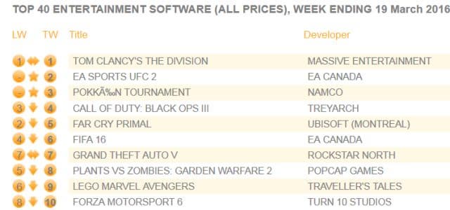 Компания Chart-track опубликовала свежие данные о продажах игр на территории Соединённого королевства. Несмотря на то, что продажи шутера The Division упали на 73%, игра осталась на первой строчки списка.