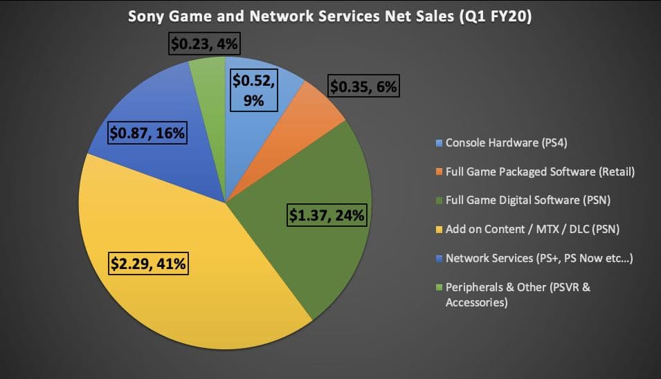 1,37 миллиарда долларов (24%) приходится на продажи премиальных игр в сервисе PlayStation Network. 0,87 миллиарда долларов (16%) принесли подписочные сервисы (PS Plus, PS Now). Благодаря продажам консолей Sony получила 0,52 миллиарда долларов (9%), а продажи дисковых версий игр принесли компании 0,35 миллиарда долларов.
