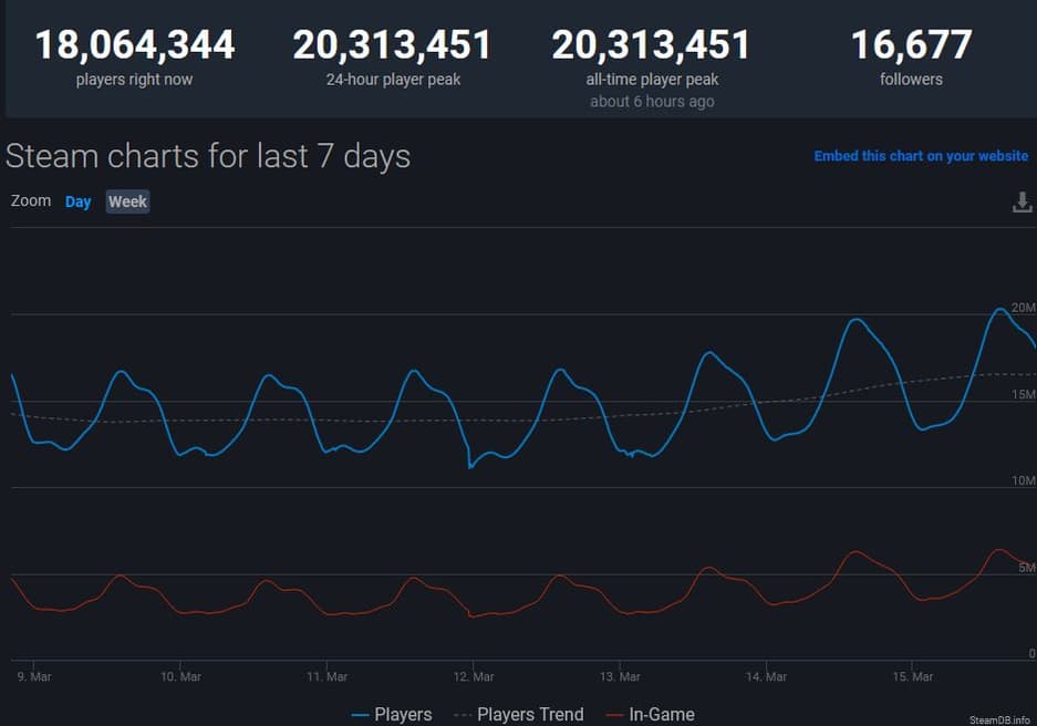Сервис Valve обновляет рекорды популярности. В течение последних 24 часов в определённых момент в Steam одновременно находилось 20,3 миллионов пользователей. Это примерно на полтора миллиона больше, чем в феврале этого года, когда сервисом Valve одновременно пользовалось 18,8 миллионов игроков.