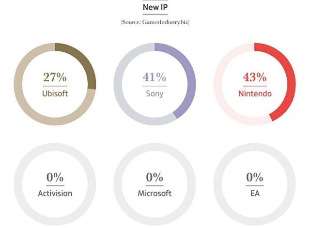 Больше всего новых интеллектуальных собственностей в 2017 году представила Nintendo. За ней следуют Sony и Ubisoft.