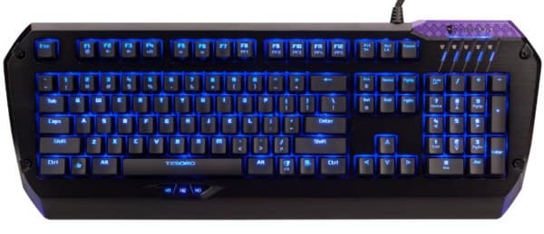 Клавиатуру Tesoro Colada Saint отличают мощный усиленный металлический корпус весом чуть более 1,5 кг, надежные механические переключатели с ресурсом более 50 млн нажатий, система Full N-Key Rollover и три клавиши под большим пальцем для быстрого вызова макросов.