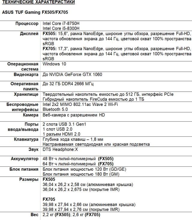 Компания Asus представила игровые ноутбуки TUF Gaming FX505 и FX705. Диагональ экрана, выполненного по технологии IPS, модели FX505 равняется 15,6 дюймам, а FX705 – 17,3 дюймам. Частота дисплея равняется 144 Гц, а разрешение - 1920 на 1080 пикселей. Экран отличается узкой рамкой NanoEdge.