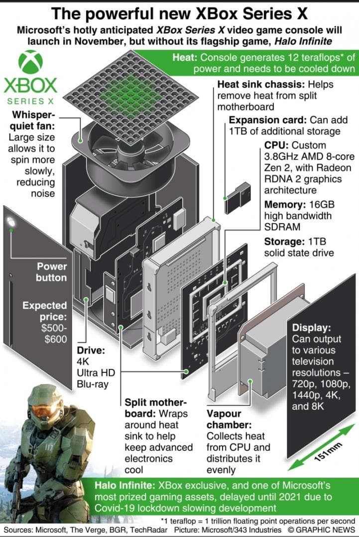 На портале Graphicnews.com появилась инфографика с представлением отдельных деталей Xbox Series X. Среди прочего можно увидеть разделённую материнскую плату, большой вентилятор и место для карт памяти. Авторы ожидают, что консоль будет стоить 500-600 долларов.