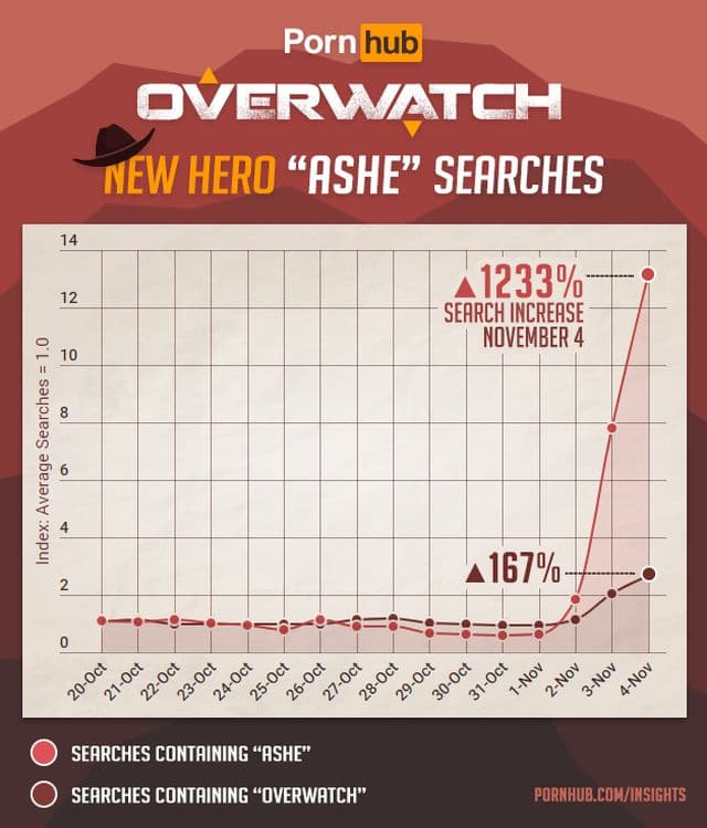 По данным администрации Pornhub, количество поисковых запросов с упоминанием Эш (Ashe) выросло на 1233% со 2 ноября по 4 ноября. Более того, количество поисковых запросов с упоминанием Overwatch к 4 ноября выросло на 167%.