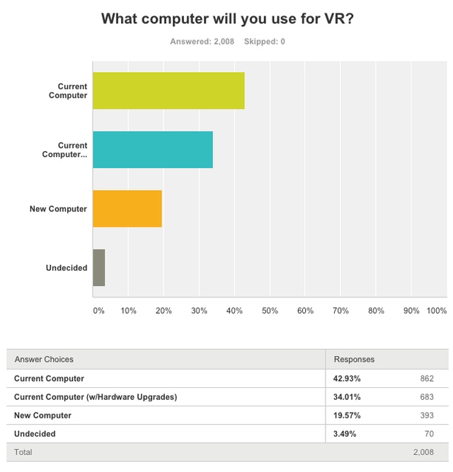 42% респондентов сказали, что не будут модернизировать свой нынешний компьютер ради виртуальной реальности. 34% – сделают это. 15% – соберут новый компьютер ради этой технологии.