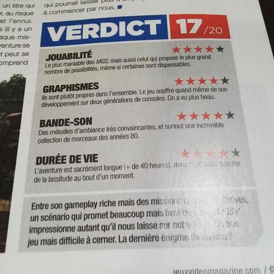 Первый обзор приключенческого экшена Metal Gear Solid V: The Phantom Pain был опубликован французским печатным изданием JeuxVideo, которое оценило свежую игру Кодзимы в 85 баллов из 100 возможных (а точнее - 17/20).