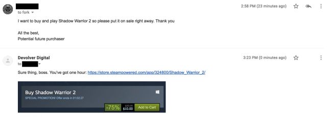 Говорили когда-нибудь себе: «Обязательно куплю эту игру, когда на неё начнётся распродажа?». Вероятно, не раз. А пробовали связаться с издателем и попросить специально ради вас устроить распродажу? Вряд ли. Но одному из потенциальных покупателей Shadow Warrior 2 пришла в голову мысль написать электронное письмо в Devolver Digital и попросить устроить распродажу игры.