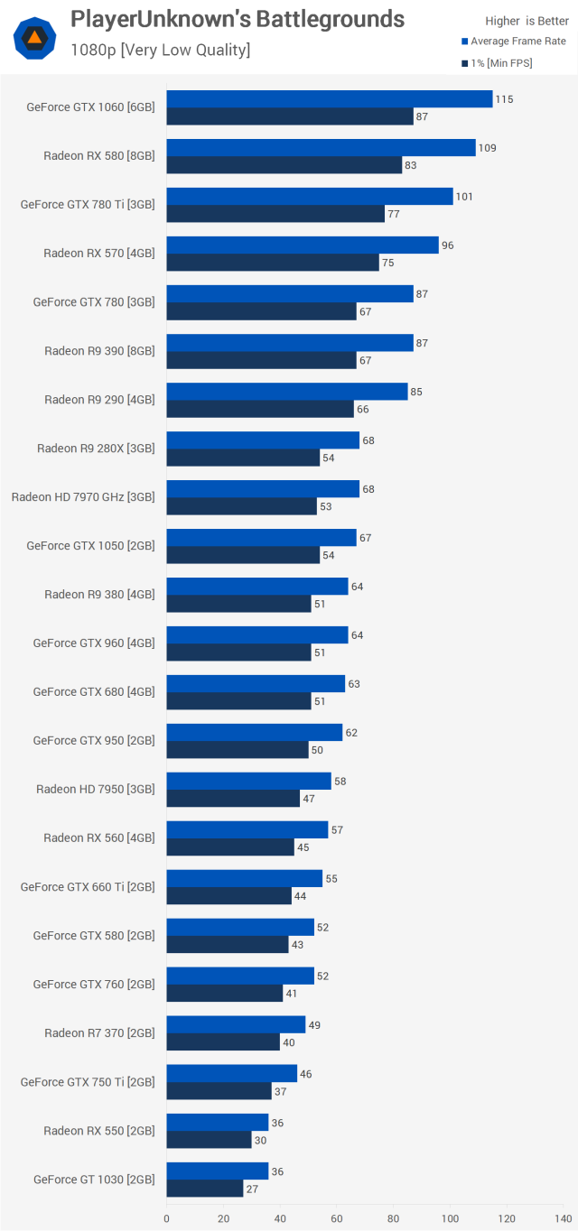 На очень низких настройках и разрешением 1080р можно достойно поиграть на видеокартах с видеопамятью от 2 ГБ.
