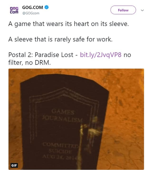 Недавно в твиттере магазина Good Old Games (GOG) компании CD Projekt появилась гифка, на которой был изображён фрагмент из Postal 2: Paradise Lost. Главный герой трилогии Postal, известный как Чувак (The Postal Dude в английской версии), писал на могилу с надписью «Игровая журналистика». На могиле также говорилось о том, что «Игровая журналистика» совершила самоубийство 28 августа 2014 года.