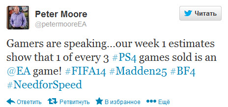 Операционный директор компании Electronic Arts Питер Мур (Peter Moore) на своей twitter-страничке оставил сообщение о том, что в в первые дни после запуска PlayStation 4 каждая третья проданная для этой консоли игра была издана ЕА.