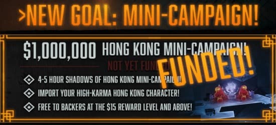 Разработчики сразу же опубликовали план по улучшению различных составляющих до $700 тыс., который был успешно выполнен. На текущий момент, когда до окончании Kickstarter-кампания Shadowrun: Hong Kong остается около 33 часов, сумма уже превысила отметку в $1 млн.