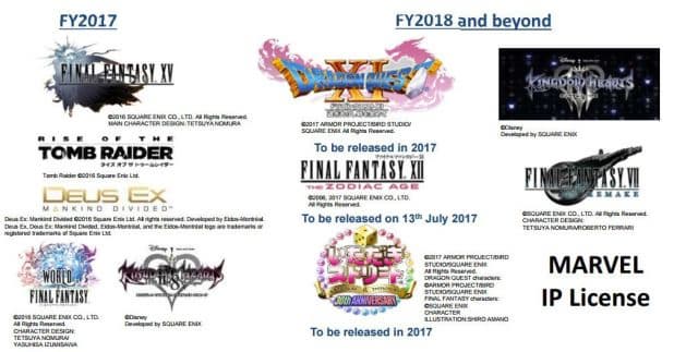 Как видно на картинке, Kingdom Hearts 3 и Final Fantasy 7 Remake появятся в 2018 финансовом году (период с 1 апреля 2017 по 31 марта 2018) или позже. Стоит отметить, что компания не указывают даже приблизительную дату выхода этих игр. При этом Dragon Quest XI ожидается в 2017 году. Ещё Square Enix в рамках недавно подписанного соглашения разрабатывает игры по мотивам фильмов и комиксов Marvel.