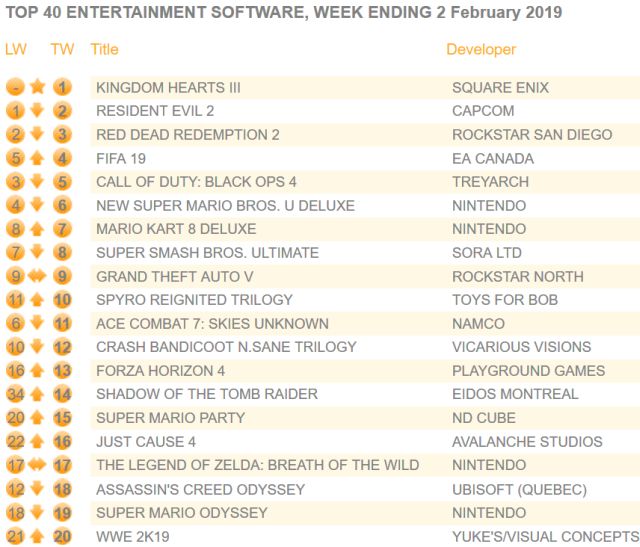 На первом месте дебютировала японская ролевая игра Kingdom Hearts III от Square Enix. Это первая часть серии, которой удалось взобраться на вершину британского чарта продаж. Проект продаётся в два с лишним раза лучше, чем Kingdom Hearts II 2005 года выпуска для PS2. Также Kingdom Hearts III продаётся лучше, чем все ответвления и «ремиксы». 82% проданных копий приходится на версию для PS4, остальные 18% - на издание для Xbox One.