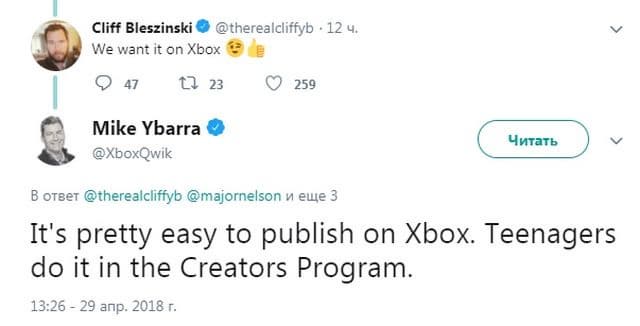 Напомним, что PUBG отлично продаётся на Xbox One, а прошлая игра Блезински «LawBreakers» в течение полугода перестала пользоваться популярностью на PC и PS4. Возможно, Клифф не против испытать удачу на другой платформе, но похоже, что Microsoft, мягко говоря, не мечтает о данном консольном эксклюзиве. Также известно, что Блезински не планирует приезжать на E3 2018.