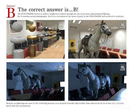 Игрокам предложили выбрать, под какой буквой находятся реальные фотографии, а под какой- картинки, полученные при помощи Fox Engine. Правильный ответ - буква В. На второй картинке говорится, что картинки демонстрируют рендеринг Fox Engine в реальном времени.