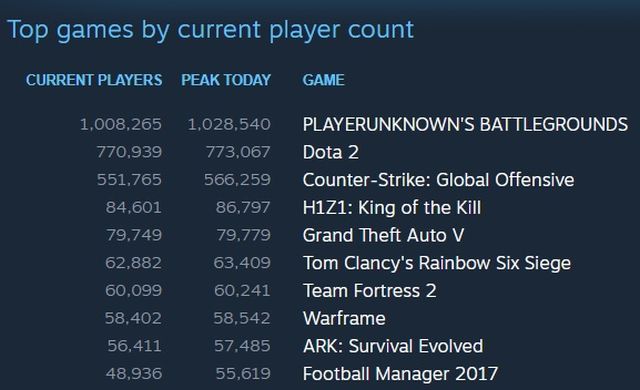 Популярный сетевой боевик PlayerUnknown’s Battlegrounds взял новую высоту. В определенный момент в PlayerUnknown’s Battlegrounds одновременно играло более 1 миллиона человек (1028540).
