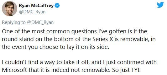 Немало пользователей задались вопросом о том, можно ли снять эту подставку. Редактор IGN Райан МакКэффри, который не нашёл способ избавиться от этого элемента корпуса, обратился к Microsoft за комментарием и получил ответ, что подставку снять нельзя. То есть если вы решите установить консоль в горизонтальном положении, то избавиться от подставки не получится.