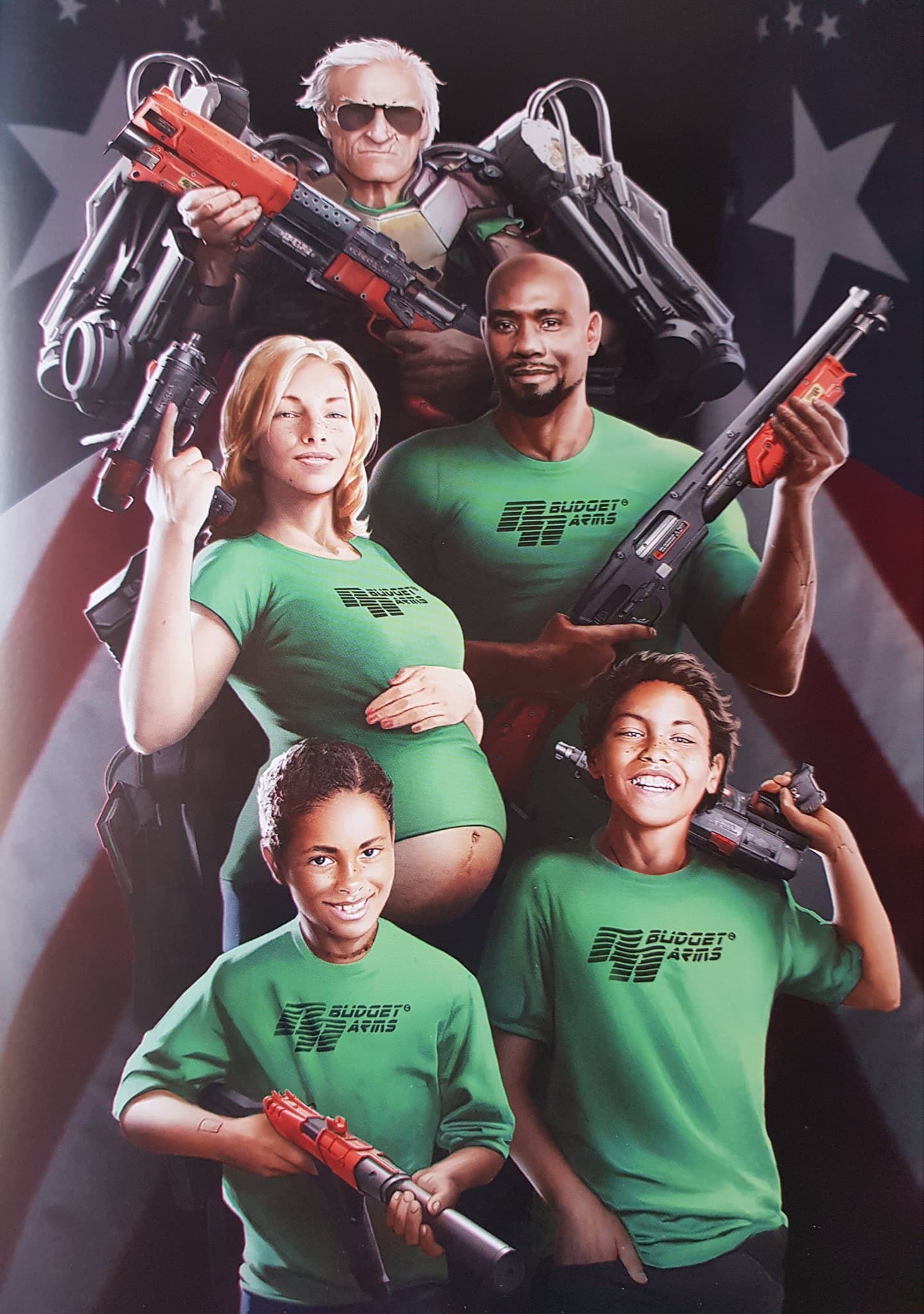 Также можно увидеть рекламу оружия для всей семьи и стильный мотоцикл.