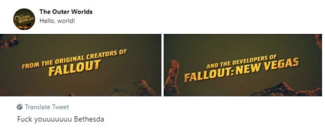 Авеллон опубликовал два кадра из ролика The Outer Worlds: «от создателей Fallout» и «разработчиков Fallout: New Vegas». Сверху картинок можно увидеть надпись «Привет, мир», а снизу: «Пошла ты, Bethesda».