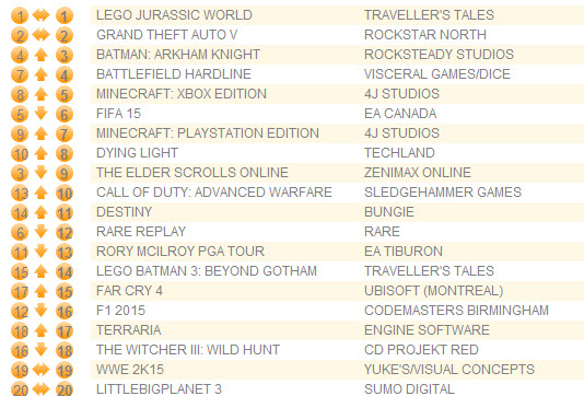 Лидером остается игра Lego Jurassic World, которая вернулась на первое место неделю назад. Для издательства Worner Bros. это 11 неделя из 34 недель, прошедших с начала года, когда чарт возглавляли игры, выпущенные этой компанией. Grand Theft Auto V также не сдвинулась со второй строчки, а Batman: Arkham Knight поднялся на третью ступень.