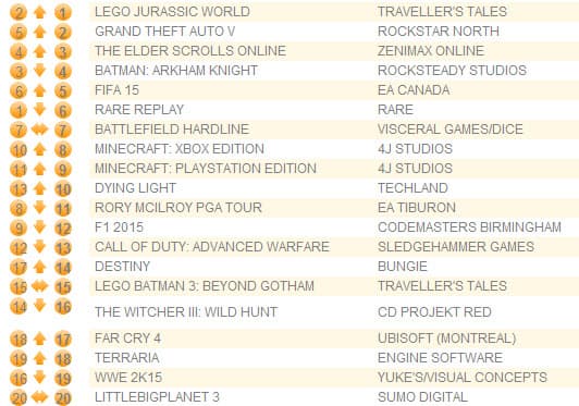 На первое место вновь поднялась игра Lego Jurassic World, второе место досталось Grand Theft Auto V, а третье - The Elder Scrolls Online. Лидер прошлой недели - сборник Rare Replay - опустился на шестую позицию.