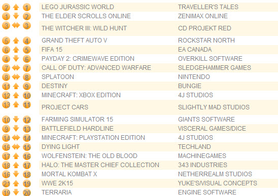 Новая приключенческая игра Lego Jurassic World заняла первое место в британском чарте, предложив второе место, которая она заняла неделей ранее, лидеру прошлой недели многопользовательской онлайновой игры The Elder Scrolls Online.