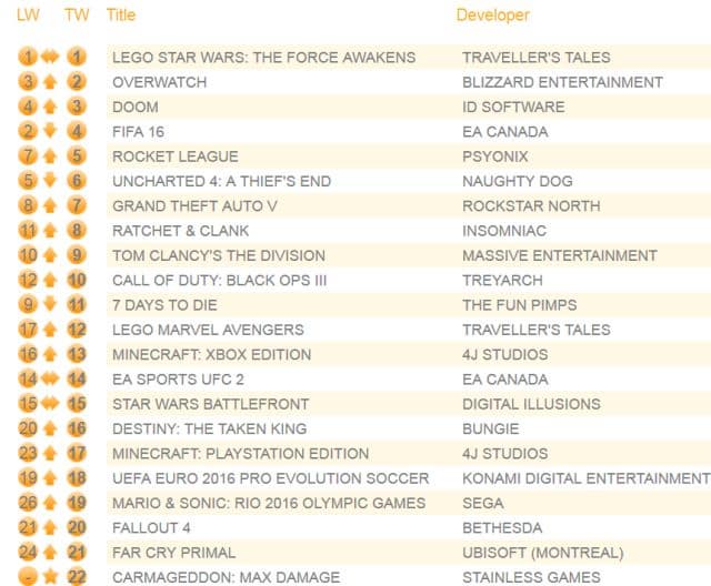 С третьего на второе место поднялся командный мультиплеерный боевик Overwatch, продажи которого упали на 2%. «Бронза» досталась шутеру Doom, продажи которого выросли на 7% благодаря скидкам. С 5 на 7 место поднялся проект Rocket League (-7%)