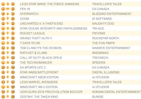 Lego Star Wars: The Force Awakens продемонстрировала четвертый по успешности результат в истории видеоигр серии Lego, а также четвертый старт среди игр по вселенной «Звездных Войн». Doom опустился с первого места на четвертое, второе и третье места достались FIFA 16 и Overwatch соответственно.
